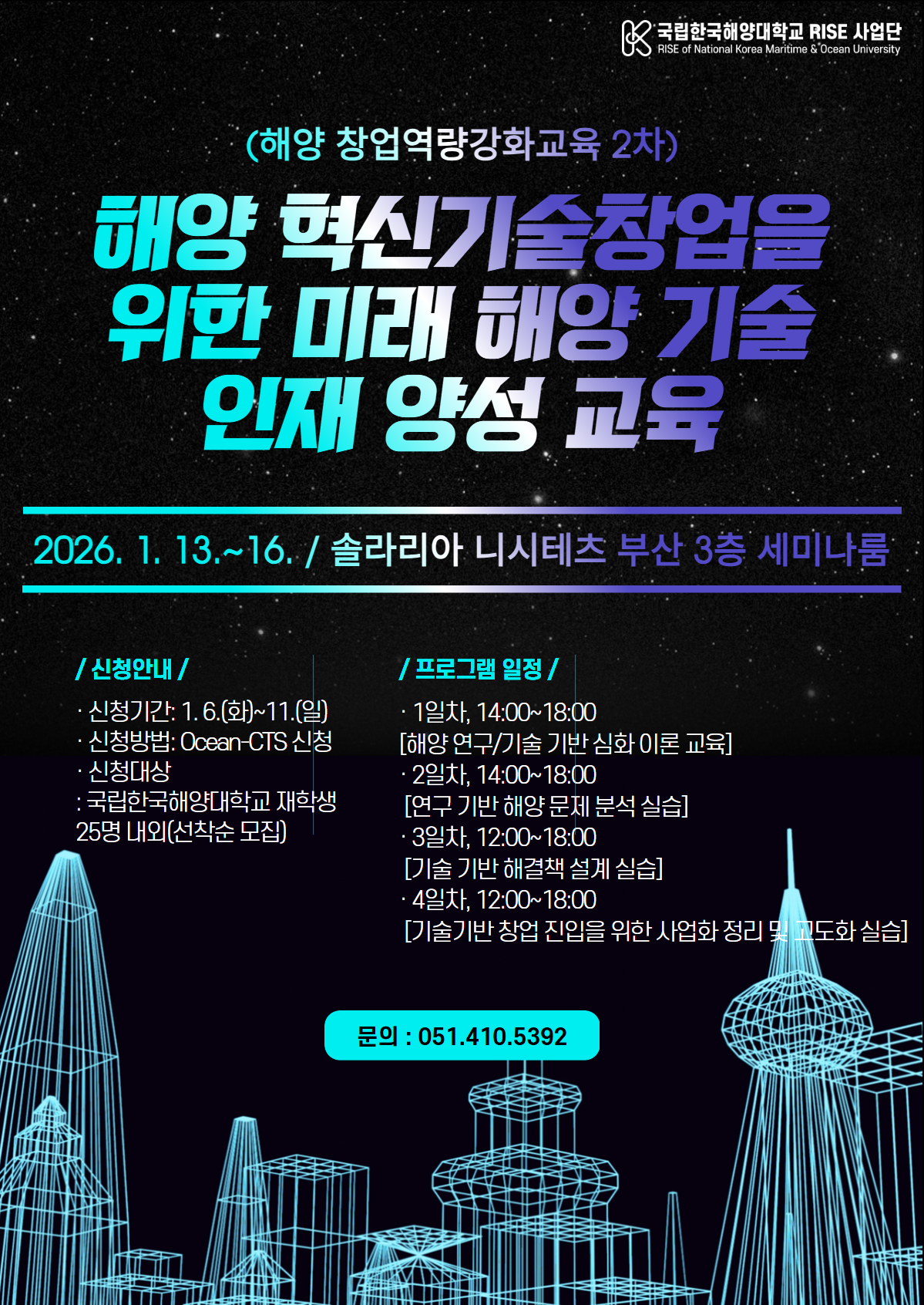 RISE 사업단에서는 (해양 창업역량강화교육 2차) 해양 혁신기술 창업을 위한 미래 해양 기술인재 양성 교육을 아래와 같이 시행합니다.